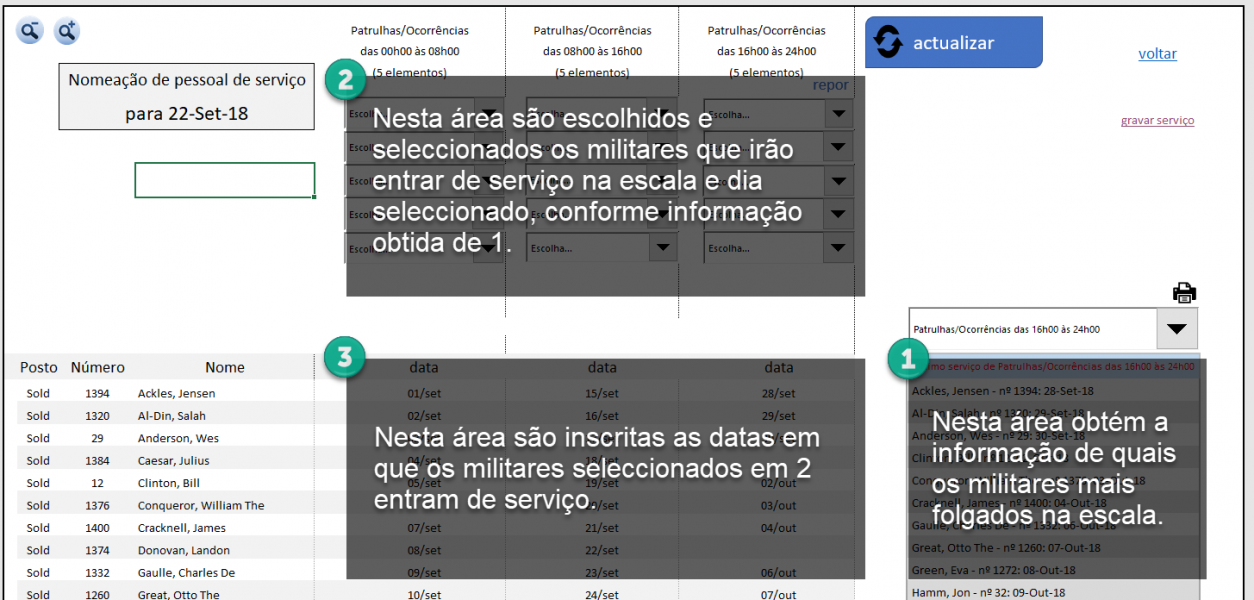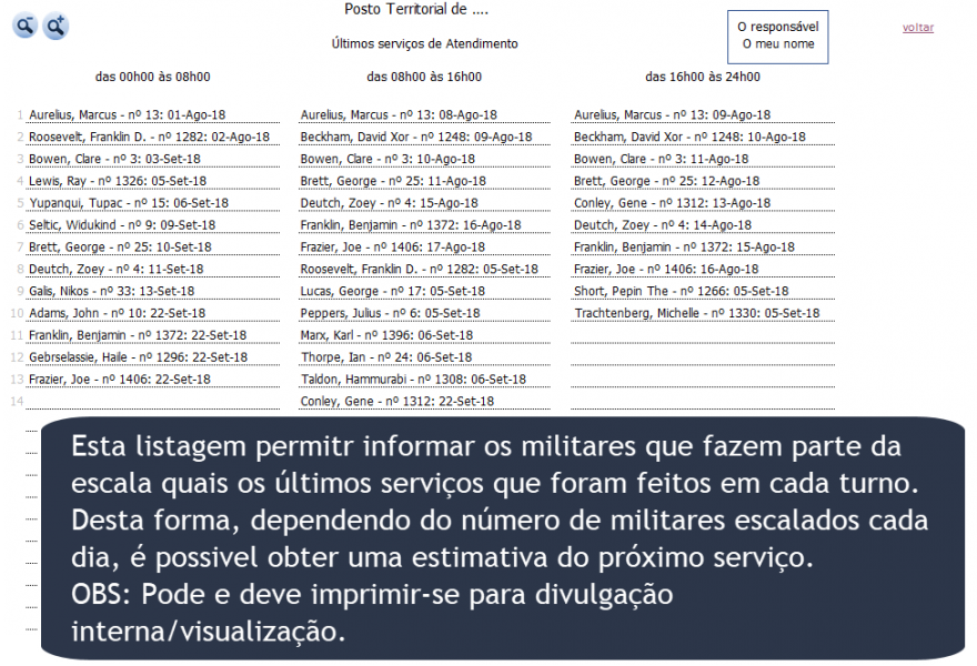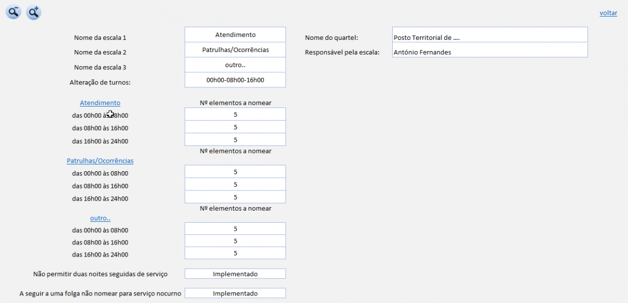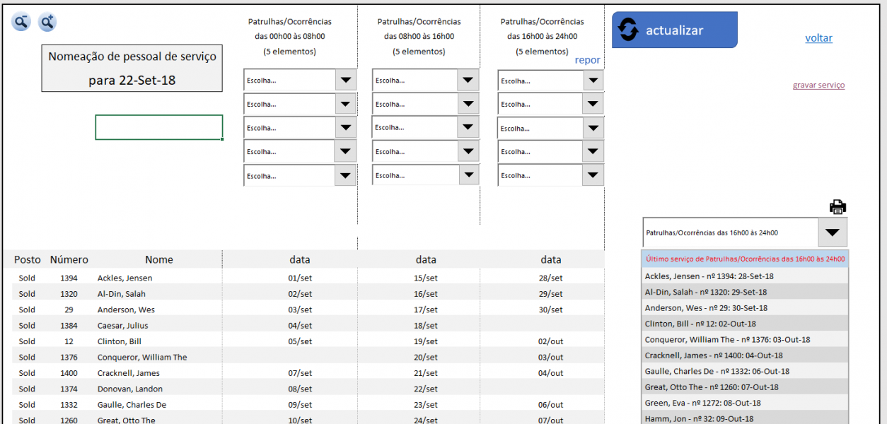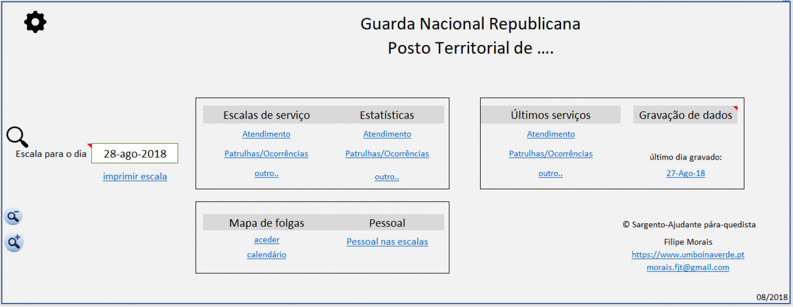 [Fevereiro 2010] Foi-me solicitada ajuda na área do planeamento dos serviços inerentes a um Posto Territorial. Nesse sentido desenvolvi uma solução informática que visa ajudar numa das tarefas dos responsáveis pela elaboração diária da escala de serviço.