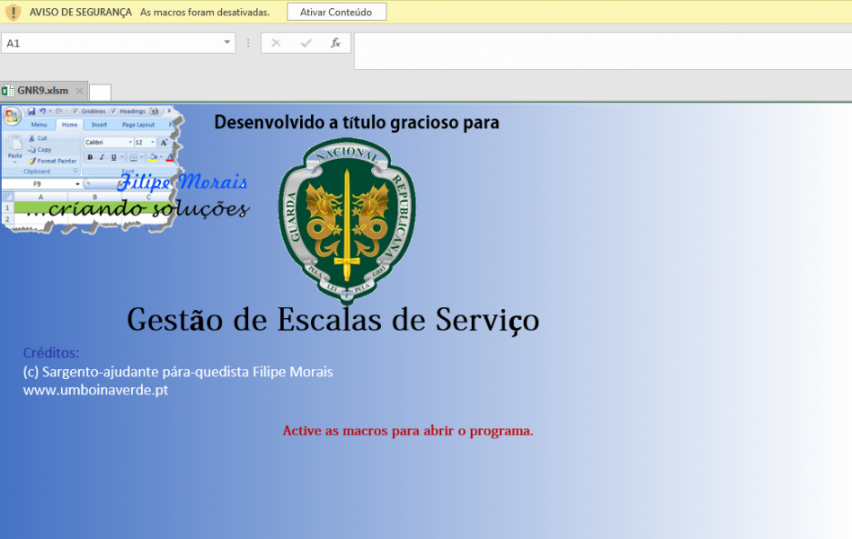 O ecrã de abertura. É essencial a activação de macros para que o programa funcione correctamente.
